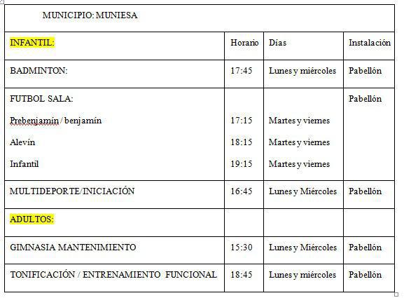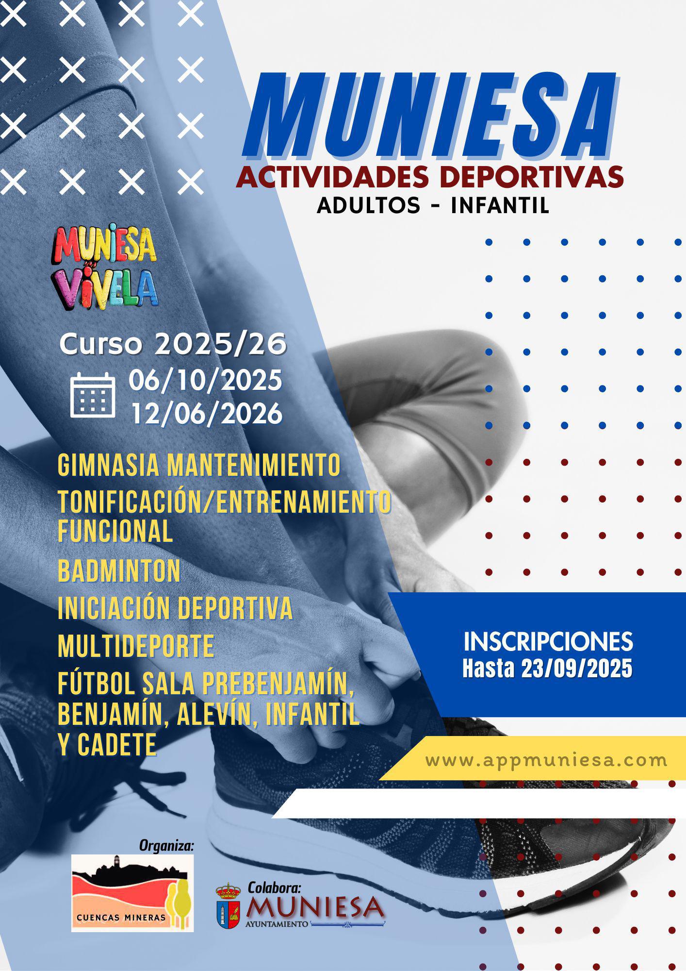 La Comarca de Cuencas Mineras, con la colaboración del Ayuntamiento de Muniesa, tiene previsto el comienzo de las actividades deportivas el lunes 6 de octubre de 2025 hasta el viernes 13 de junio de 2026. Las actividades se desarrollarán durante 8 meses (las dos semanas de Junio son por el descanso navideño y de Semana Santa).
