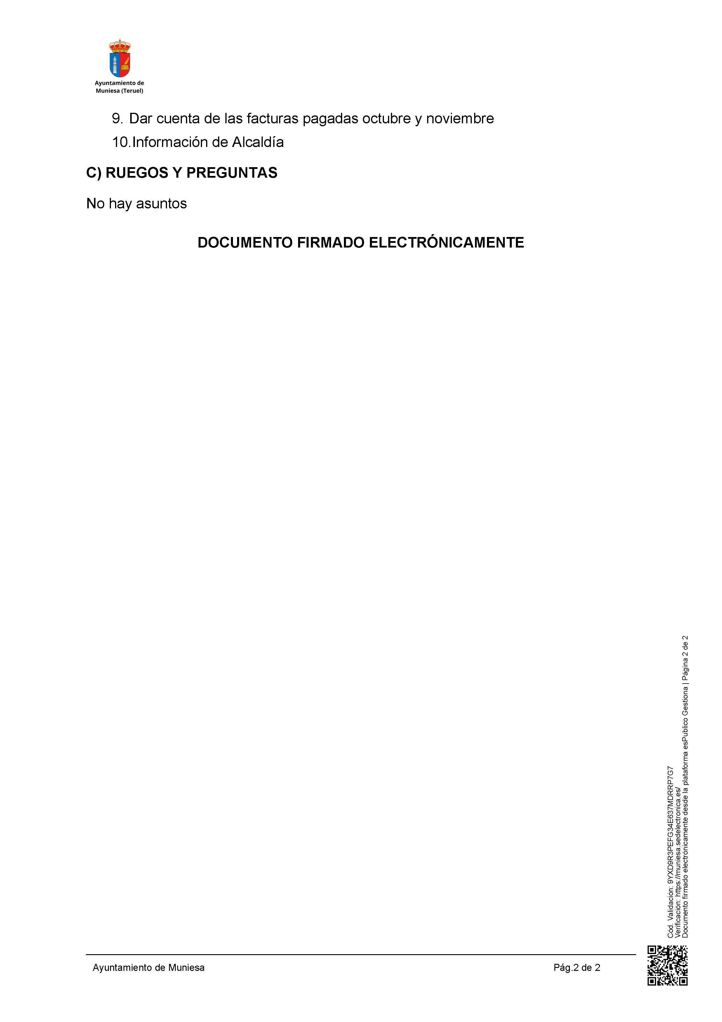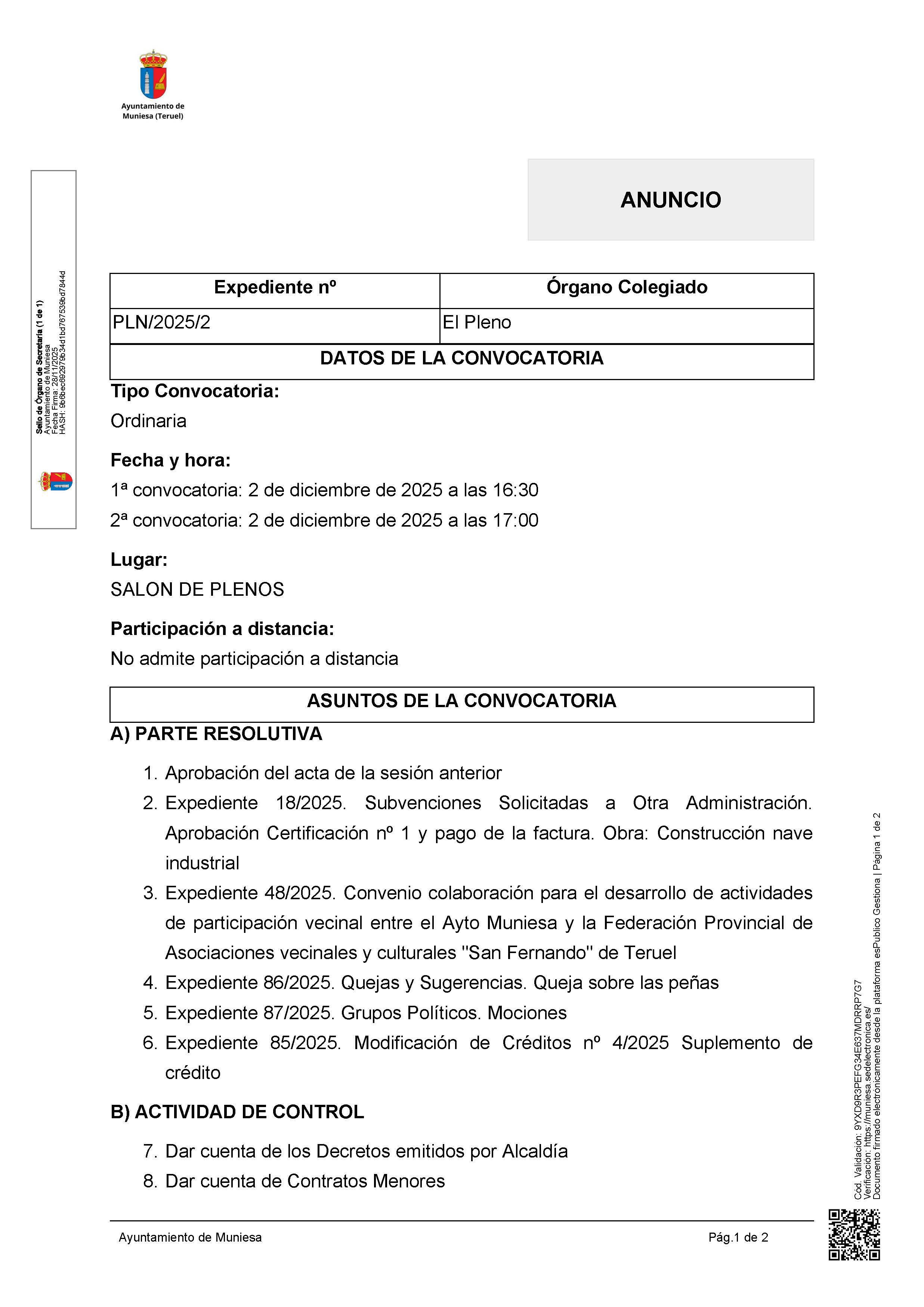 Tal como está anunciado en el tablón de anuncios de la SEDE ELECTRÓNICA del Ayuntamiento, se recuerda que el martes 2 de diciembrebre, a las 16:30 h. está prevista la celebración de un Pleno Ordinario del Ayuntamiento de Muniesa. Abajo convocatoria y detalle del orden del día.