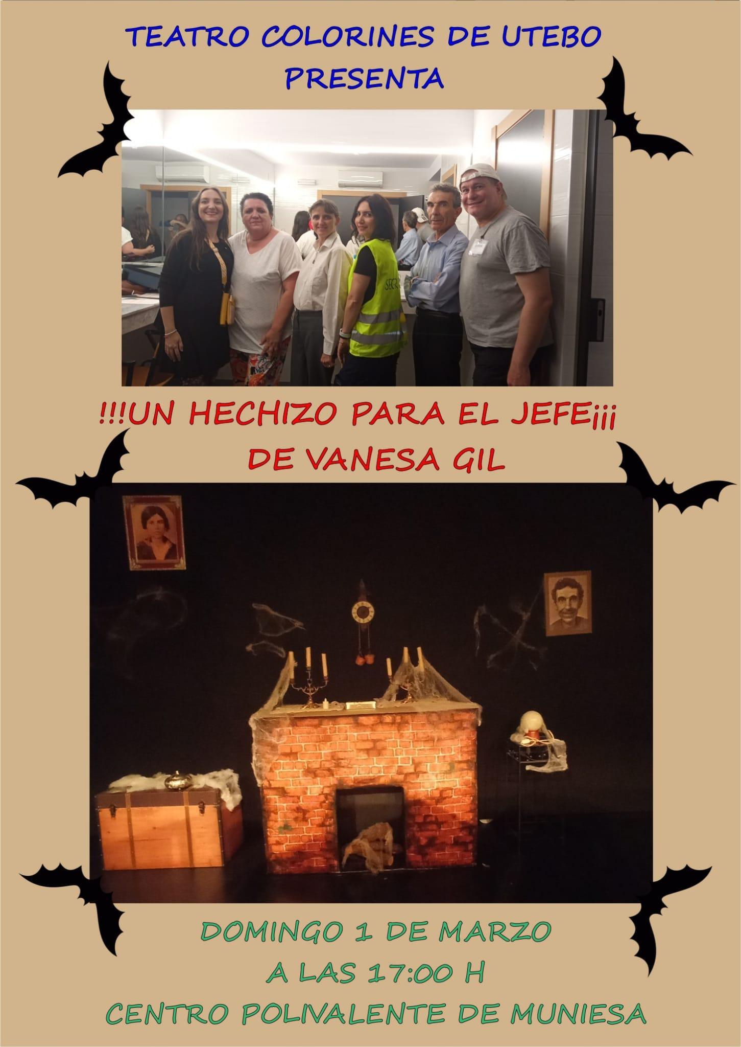 El Grupo de Teatro Colorines presenta la obra de Teatro "Un hechizo para el Jefe" que tendrá lugar el próximo domingo 1 de marzo, a las 5 de la tarde en el Centro Social polivalente.