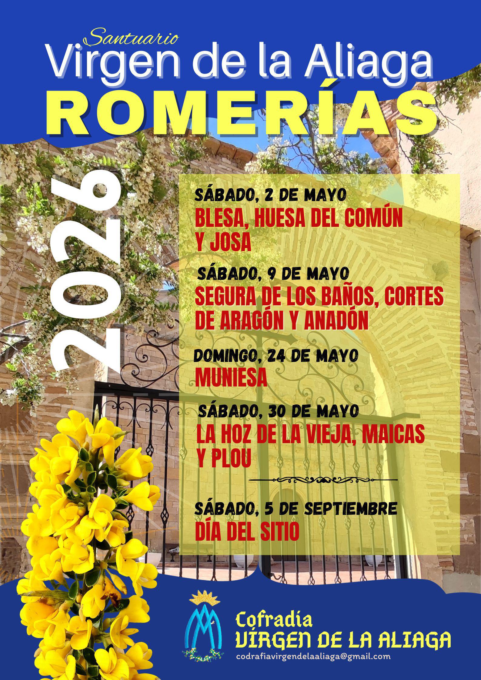 La Cofradía de la Virgen de la Aliaga informa de las fechas en que tendrán lugar las Romerías al Santuario de la Virgen de la Aliaga, y el Día del Sitio, durante este año 2026, para los diez pueblos que forman parte del ámbito de la Cofradía y el Santuario: Anadón, Blesa, Cortes de Aragón, Huesa del Común, Josa, La Hoz de la Vieja, Maicas, Muniesa, Plou y Segura de los Baños.
